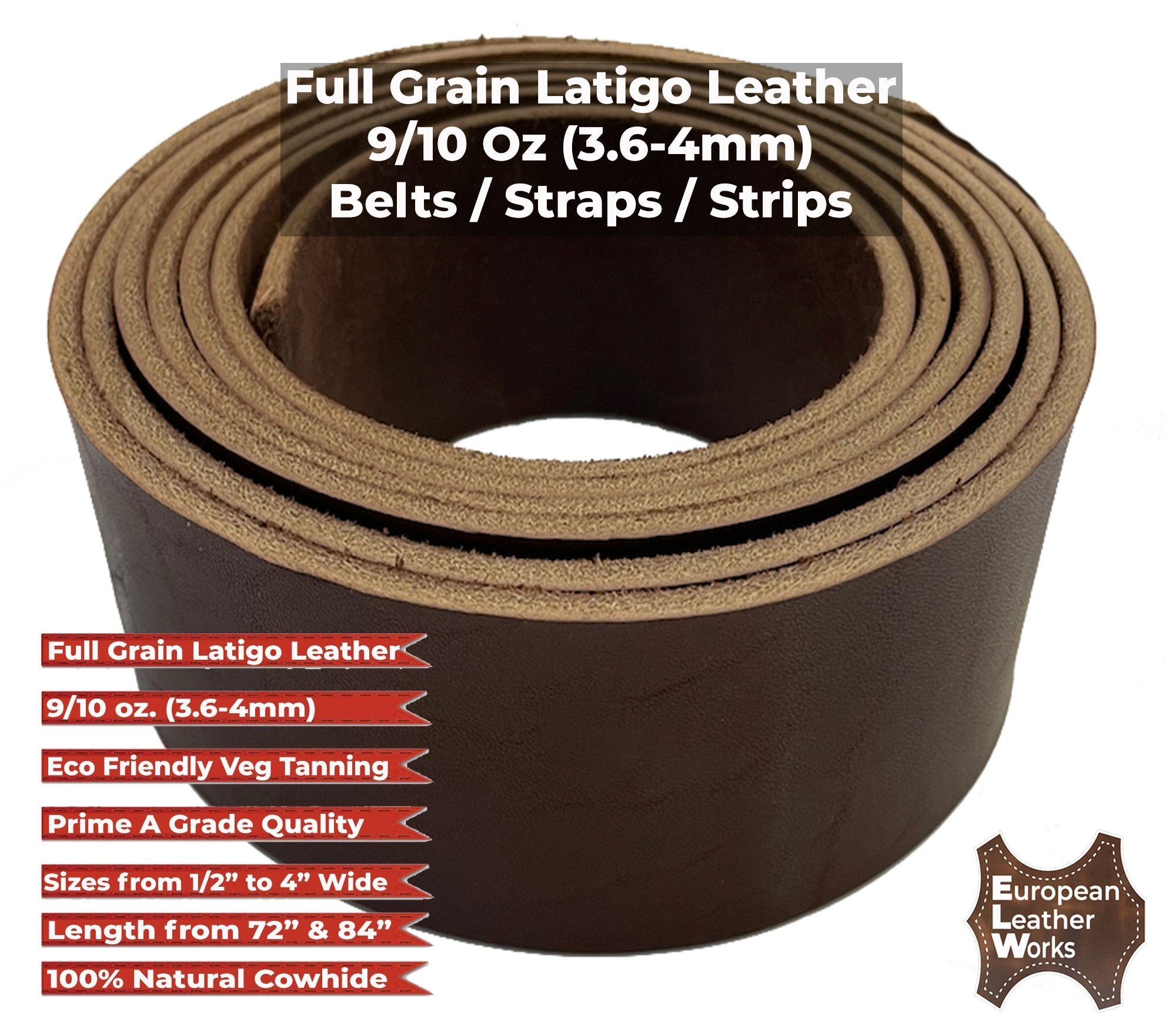 European Leather Works (ELW) Latigo Tanned Full Grain Leather 9-10 oz (3.6-4mm) Thickness Weight Cowhide Tooling Leather Latigo Belt Blanks, Strips, Straps from 1/2” to 4" Wide and 72" & 84" Lengths.