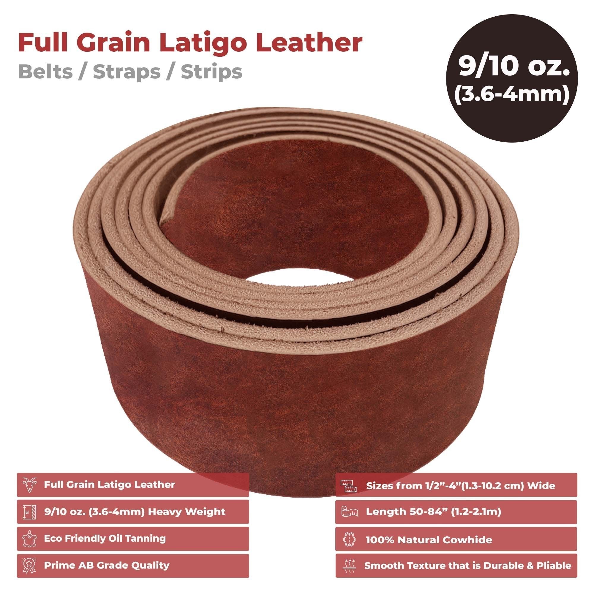 🛡 BELT GRADE LATIGO LEATHER: 9-10oz (3.6-4mm) Available in different sizes Latigo Belt Leather straps made from thick real natural cowhide; Smooth and soft top grain leather with suede bottom; Flexible yet strong; Colorfast and bleed-free; Pre-finished, oil tanned, heavy-duty blank flat leather strapping.