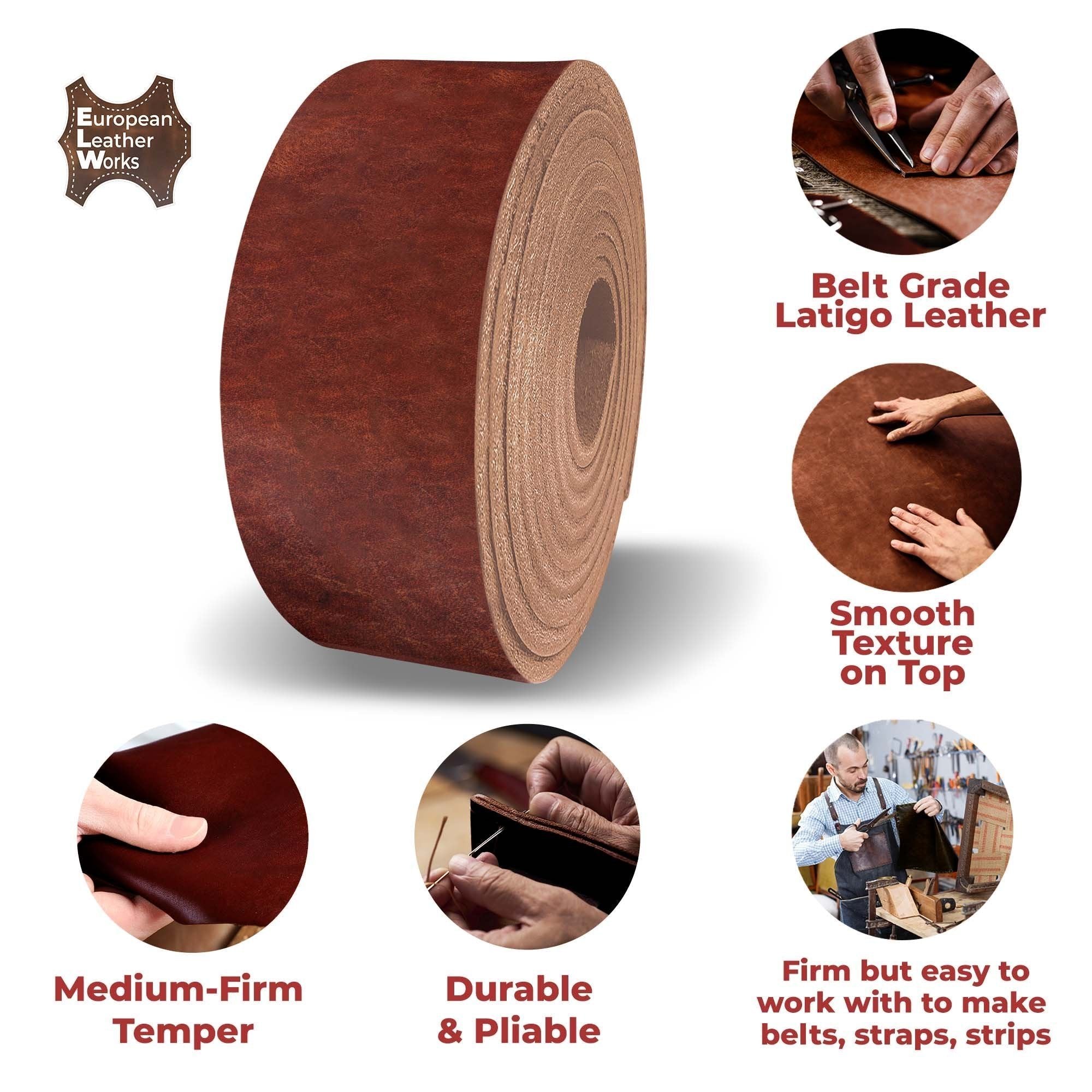 European Leather Works provides belt-grade Latigo Leather that is made of thick, real, & natural cowhide material which you will find in different sizes between 0.5" to 10" wide and 72" Length and color variations such as Brown, Whiskey Tobacco, Cognac, Dark Brown, Bourbon Brown, Chocolate Brown, Burgundy, Wine, Chestnut, Antique Brown, Vintage Brown, Red, Blue, White, and, Tobacco Brown.