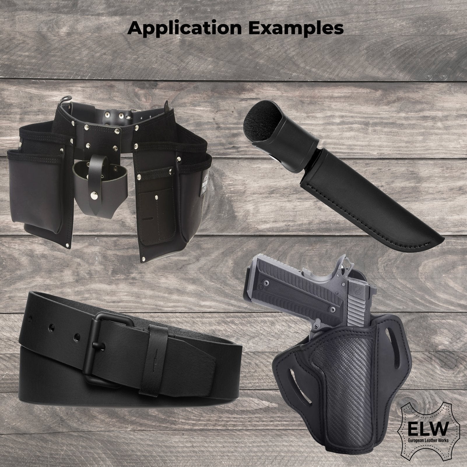 European Leather Works (ELW) 100% Oil Tanned Black Full Grain Leather Cowhide Pre-Cut Pieces 9-10 oz (3.6-4mm) Import AA Grade Tooling Leather HideVegetable Tanned Leather for Tooling, Carving, Molding ✅9-10 oz (3.6-4mm) HEAVY WEIGHT THICKNESS. Bull Hide Leather. Not Weak as Cowhides. Fit for all Leather Craft Projects Perfect for Tooling, Engraving, Stamping, Molding, Dyeing, Crafts. ✅ Size & Color:  12"x 12", 12"x 24", 12"x36", 12"x48", 24"x 24", 24"x36", 24"x48", 2PCS 12"x12", 2PCS 12"x24", 4-6 SQ FT, 6-8 SQ FT, 8-10 SQ FT | BLACK Color | Quickly get to work on your leathercraft and tooling projects we these pre-cut pieces. ✅TOOLING LEATHER: Oil Tanned tooling leather shapes cut from our double square shoulders full grain cowhide leather. ✅ 100% NATURAL FULL GRAIN LEATHER: Imported from European young steers, bulls. Bull Hide Leather. Not Weak as Cowhides. Tanned with Italian tech and Natural Vegetable Oils ✅CRAFTSMEN GRADE QUALITY & 100% USEABLE: NO HOLES, NO QUESTIONABLE MARKS, also BEGINNER-FRIENDLY! This leather is the highest in quality that you can find, this isn’t scrap or leftover leather, this is Full Grain, high-quality leather that is cut with you in mind. 📌 APPLICATIONS: Knife sheath, Gun Holsters, Guitar covers, Saddles, Ancient Leather Armours, Jewelry Boxes, Map Tube Boxes, Insoles, Shoes, Hats, Belts, Cell Phones Cases, and other leather projects. European Leather Works is not just a seller of these leather pieces, but we craft our own products and do our own projects. The leather we sell must be meet our years of experience plus very high standards!
